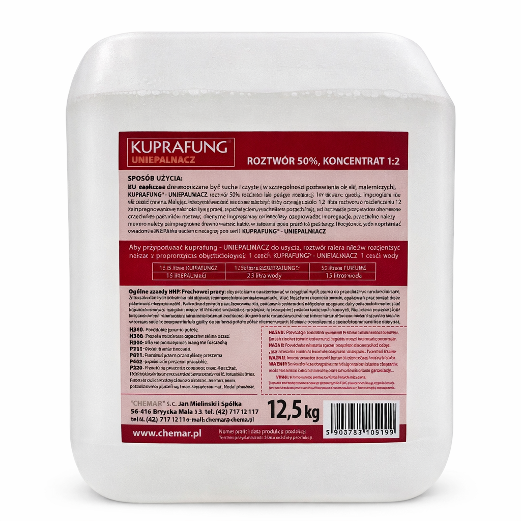 Impregnat ogniochronny KUPRAFUNG –UNIEPALNIACZ jest przeznaczony do zabezpieczania przed działaniem ognia elementów budowlanych z drewna o gęstości nie większej niż 890 kg/m3 (z wyłączeniem drewna egzotycznego), stosowanych na zewnątrz i wewnątrz budynków mieszkalnych, gospodarczych i użyteczności publicznej, o grubości co najmniej 16 mm.